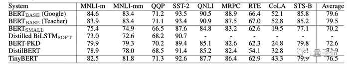 在GLUE基准上,TinyBERT的性能与BERT相当,仅下降了3个百分点。