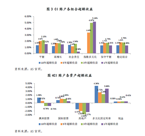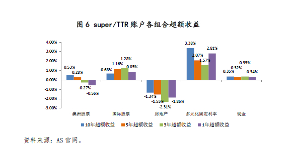 从超额收益来看,与投资基准相比(具体投资基准见附录三),CI和super/TTR的各个组合的投资收益均超越基准,1年、3年、5年、10年的实际投资业绩都高于投资基准,其中指数多元化超额收益最高。CI和super/TTR的各类可投资产的超额收益中,多元固定利率在1年、3年、5年、10年都最高且为正,国际股票超过基准,澳洲股票在1年和3年不及基准,5年和10年超过基准,房地产则是各年都不及基准。