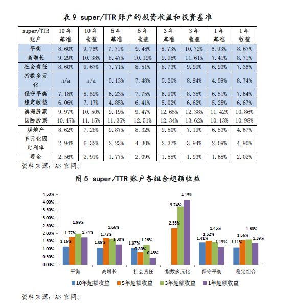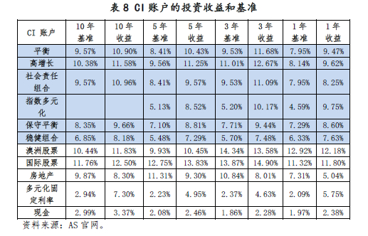 从AS的不同账户来看,CI和super/TTR的“同名”组合收益也存在差异,CI比super/TTR的收益普遍要高。投资收益都是扣除投资费用和税收以后得出。投资收益的差别主要在于税收和费用的差异。(1)对于CI账户的收益不扣税(notax is deducted from the crediting rates of Choice Income members),而对于TTR和超级年金账户super的投资收益最高纳税15%。(2)对于高增长组合,收益的差别也来自于费用,TTR账户的高增长组合的投资表现费率为0.11%,而CI账户的相应费用为0.10%。