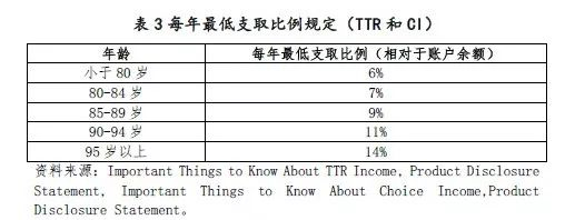 (3)每年收到账户余额的6%,80岁以后支取额度会提高,TTR和CI账户的具体的最低支取比例规定一致(表3)。