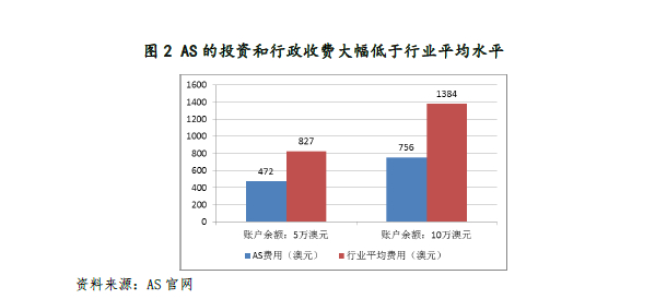 投资业绩及费用和成本的微小差别会在长期导致收益的显著差别。例如,如果年度总费用和成本占账户余额的2%而不是1%,将导致30年投资收益相差20%以上。AS的宣传重点之一是其低成本。AS的收费低于年金账户的平均收费水平。