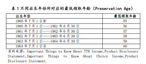 (2)退休过渡账户(Transition To Retirement,以下简称TTR),是会员在达到最低领取年龄(Preservation Age)后,一边工作一边领取超级年金的账户,为向完全退休过渡。申请TTR账户需要达到最低领取年龄,并且是澳大利亚国民、永久居民、新西兰国民、或持有符合条件的退休签证[3]。