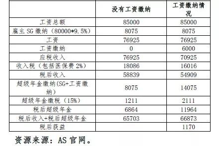 某会员年龄45岁,年收入8万澳元。如果通过工资缴纳将6000澳元缴纳到超级年金账户,则会获得1170的税后收益,同时在超级年金账户中增加了储蓄。以下计算中雇主的超级年金保障缴纳为9.5%。