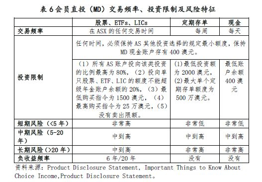 自己操盘并不适合每个人,而且风险很高。该项安排需要会员深谙投资和市场,可以管理自己的投资。TTR账户下,未纳入会员直投这一投资选择。AS对于会员直投提出了较高的申请门槛。具体申请条件包括:(1)CI会员账户必须有至少5万澳元。(2)超级年金账户必须有至少1万澳元。(3)如果会员既有超级年金账户,又有CI账户,则只能有其中之一可以选择MD投资安排。(4)当从MD账户转到CI账户,且申请了无缝对接ST[10],则MD的资产可以转移到CI。(5)任何时间至少在现金账户有400澳元。(6)会员必须至少有1万澳元或是收入支付储备(以更高的一个为准)投资到PreMixed或DIY中的至少一个。收入支付将从MD账户之外的其他账户进行扣减。(7)对于股票、ETFs、LICs及定期存单的投资有限制。(8)当开始MD投资后,会员的CI账户必须有至少3万澳元;当总账户余额低于3万澳元时,会员将不得不退出MD投资安排。