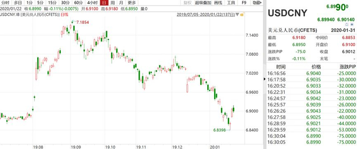 1月22日,虽然在岸人民币低开,但盘中反转,收涨53点报6.9012元,夜盘盘初又回到6.8元一线。