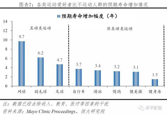 运动方面,经常锻炼有益于延长寿命。一项涉及8500余人的25年追踪调查研究显示,相比不运动人群,运动人群预期寿命增长2-10年,其中网球、羽毛球等互动类运动的延长寿命作用比游泳、慢跑等非互动类运动更为明显。