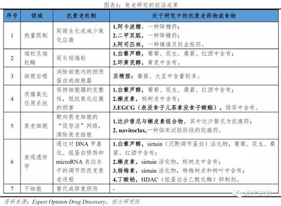 细胞自噬。细胞自噬即细胞内的损伤蛋白或细胞器被溶酶体降解并循环利用的过程,与细胞的生长、发育、衰老及癌变相关,其发现者于2016年获得诺贝尔医学奖。研究发现,细胞自噬的激活具有抗衰老功能,目前发现的细胞自噬激活剂以亚精胺为主,其延长寿命的作用已在小鼠中被证实。亚精胺广泛存在于动植物体内,食物来源包括蘑菇、豆类等。