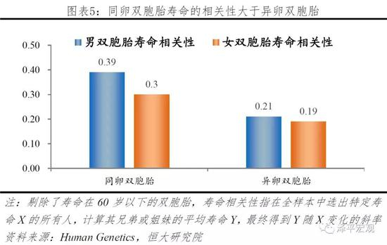 遗传差异包括性别差异、种族差异和个体差异,三者均对寿命有较大影响。种族差异方面,美国各个族裔的寿命差异最大达到了12年,其中亚裔人最为长寿,说明了黄种人基因在寿命方面的优势;性别差异方面,各个国家女性预期寿命均比男性长,全球平均长4.4年;个体差异方面,同卵双胞胎之间的寿命相关性大于异卵双胞胎,基因差异对于个体寿命的影响毋庸置疑,拥有长寿基因的个体更有可能长寿。