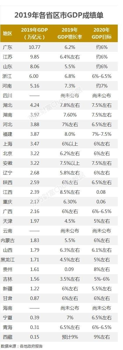 2019年各省区市GDP成绩单:广东率先突破10万亿
