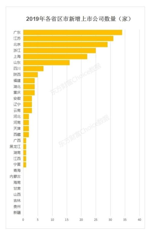 2019年,全国共新增203家A股上市公司,其中,2019年广东新增34家上市公司,位居榜首;江苏新增31家上市公司,排名第二;北京则增加29家,排名第三。
