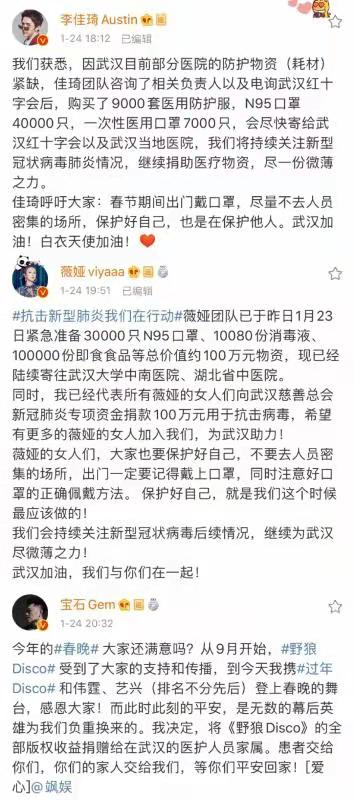 同样捐赠多种医疗物资,帮助武汉解决医疗物资紧缺燃眉之急的,亦不乏周震南全球后援会、TFBOYS粉丝站、等各家粉丝。