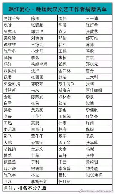 据悉,此次募集善款1150万元人民币,募捐开始后不久韩红也在微博公开了捐赠物资的明星。放眼该名单,易烊千玺、陈明、王一博、鹿晗、吴亦凡、杨洋、范丞丞、李汶翰等流量位列其中,也不乏张靓颖、陈晓、陈妍希、郭京飞、袁弘、张歆艺、吴奇隆、刘诗诗、邓伦、王鸥、陈赫、黄轩、钟楚曦、陈飞宇、景甜等明星艺人。