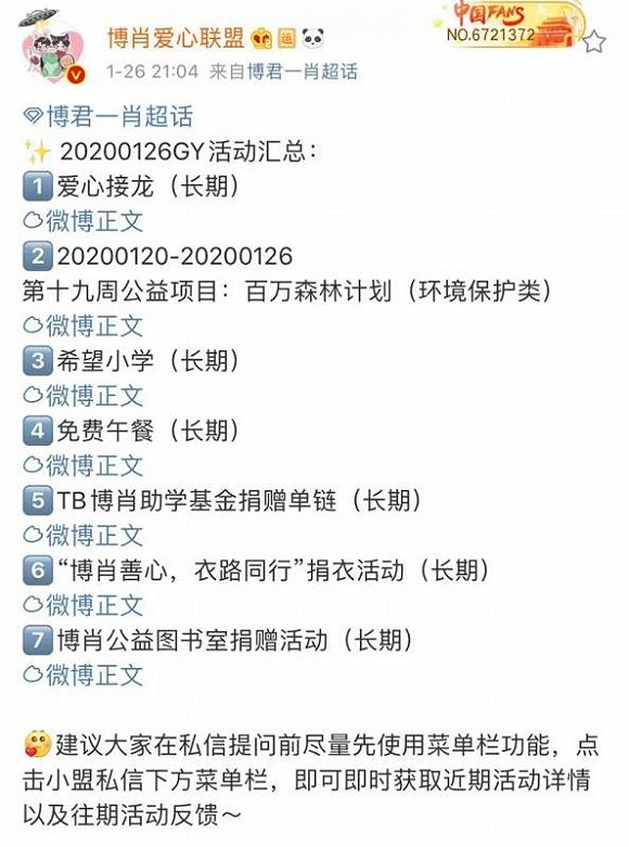 在此次疫情之前,粉丝以偶像名义做公益已经十分常见。图片来源:肖战粉丝公益站微博