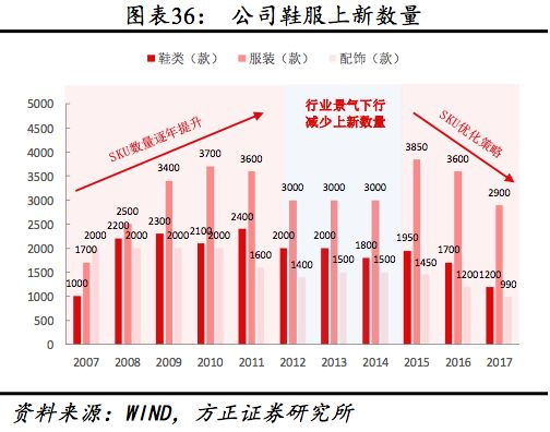 优化SKU,专注热销产品。上市以来公司加快产品上新力度,年上新款数量实现明显增长。2016年起提出优化SKU、专注畅销品销售策略,2017年鞋、服装、配饰上新数量分别较2015年减少38.46%、24.68%、31.72%至1200、2900、990款,推动销售同时增强研发成本效益。