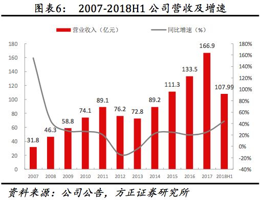 营收提速明显。2017公司营收达166.93亿元,同比增长25.08%,较上年提升5.14 pct。2018H1公司营收达107.98,同比增长44.06%。