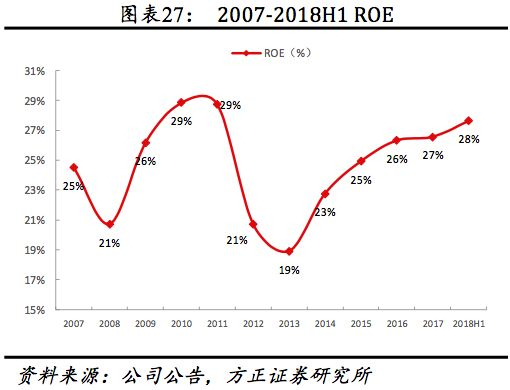 财务费用率维持低位并持续下降,2017、2018H1财务费用率均为0.09%,2012-2017财务费用率年均减少0.03pct,公司有息债务有限,2018H1已获利息倍数达298.70倍,较2012年年均提升0.56倍。
