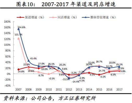 (3)从渠道看:2014起同店成为营收增长主因,2017同店、渠道增速同增,业绩迎高景气。①2012行业低谷前,渠道、单店面积拓展为业绩高成长主因。2007-2011年渠道数量、同店营收、营收年均复合增速分别达18.49%、9.16%、29.34%(2008-2011年单店面积、坪效平均增速分别达7.53%、1.52%),②2012行业低谷后,同店逐步成为增长主要来源。渠道自2012后整体持平后自2016起受FILA等新品牌重新步入高单位数增长,2017继续加速;公司同店2014后在渠道增速下降后,成为公司营收增长主要来源,2017在行业复苏、拓店加速背景下一同带动公司业绩重回高景气。