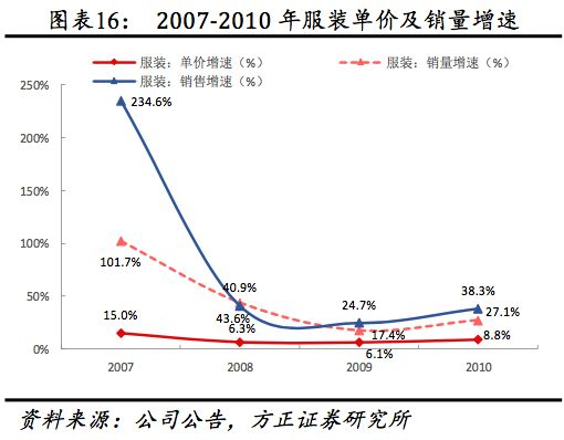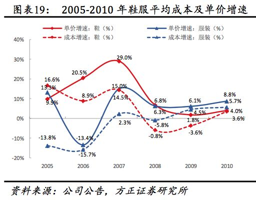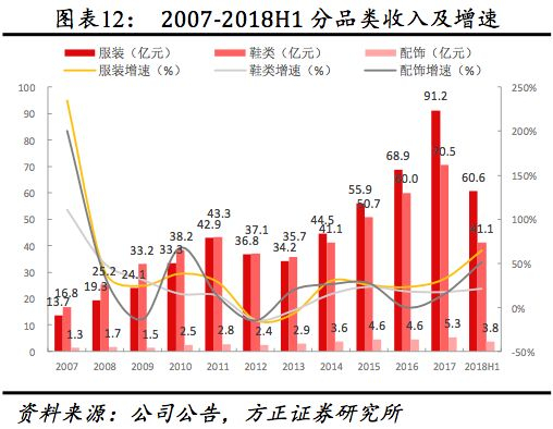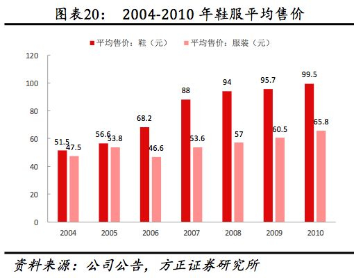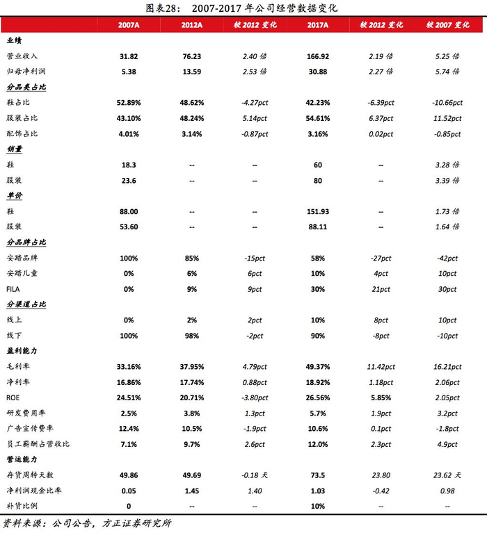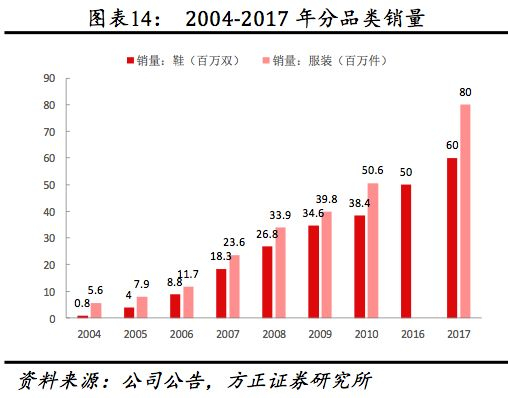(4)从量价看:量、价持续稳增。2017年公司共销售超6000万双鞋、8000万件服饰,公司预计2020年鞋服销量分别达1亿双/1.3亿件。2007-2017年鞋、服装销量年均复合增速分别为12.61%、12.98%,同期单价复合增速为5.61%、5.10%。