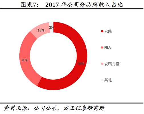 (3)从结构看:受FILA营收占比提升影响,服装占比持续上升。2017年服装、鞋、配饰收入占比分别达54.61%、42.23%、3.16%,分别较2008年提升12.85pct、 -12.27pct、-0.58pct,受2009年收购服饰占比较多的FILA以及其持续增加的营收占比影响,服装营收占比自2009年起持续增加,至2017年均增加13.59pct。2017年安踏、FILA、安踏儿童收入占比分别约58%、30%、10%。