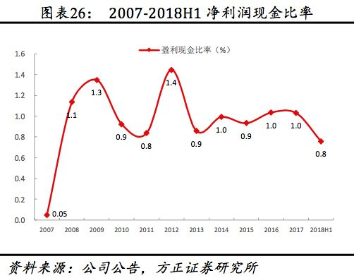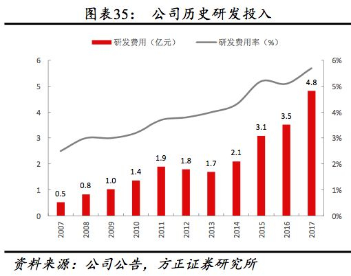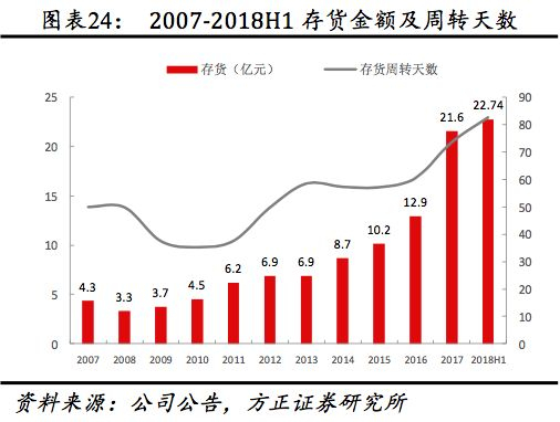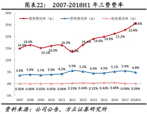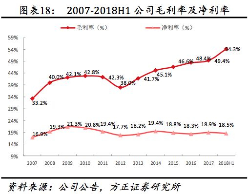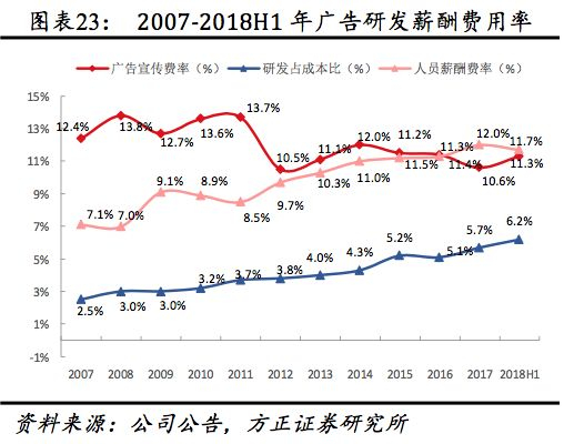 管理费用率自2012后整体持平,2017受多品牌布局加速、研发费用率提升影响同比小幅提升0.27pct至5.40%,2018H1管理费用率同比下降1.28pct至4.79%,2017研发投入占成本比重较2007年的2.3%提升超过1倍至5.7%,2018H1提升至6.2%,其中人员薪酬费用,上市以来公司人员薪酬费率稳健增长,2017年人员薪酬支出占收入比达12%,较2007年提升4.9pct,其中2009、2017年上升幅度明显高于其他年份主要系团队规模扩大及高管聘任。