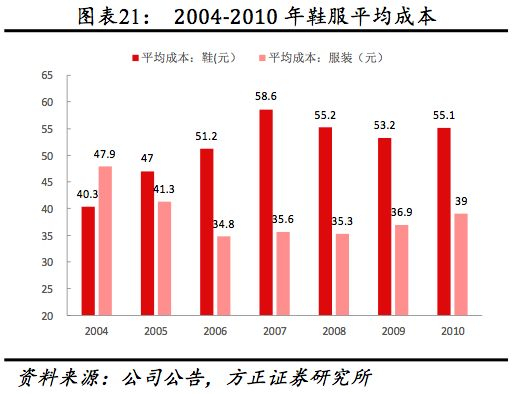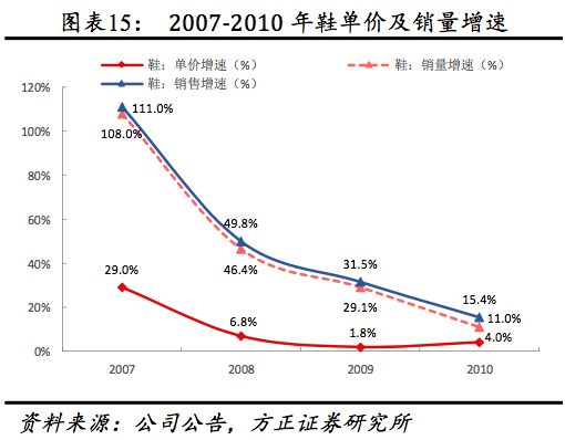 产品方面,2008、2009、2011年公司分别推出9-14岁儿童系列(2011年扩展至3-14岁,目前针对0-14岁)、15-28岁运动生活系列、多元化女子体育用品系列产品。渠道方面,2011年公司门店数达9517家,2008-2011年均新增门店934家,超上市以来年均590家净开店数。2012年受行业景气度影响净关店309至9208家。生产方面,2012年鞋底、鞋类、服装产量较2007年底增加1.15、1.41、7.33倍至1130万双、1610万双、740万件,鞋类生产线数量由2007年的15条增加至29条。