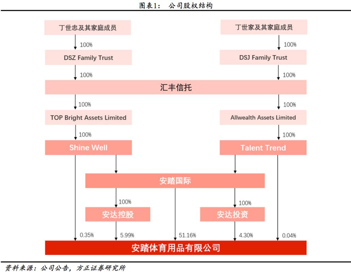 丁氏家族持股达61.84%,股权集中。截止2018年6月,丁氏家族共通过安踏国际、安达控股等持有公司61.84%股权,公司股权集中。另外,执行董事兼安踏品牌总裁郑捷持股0.04%。