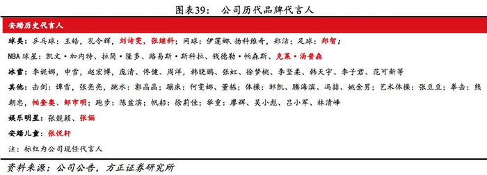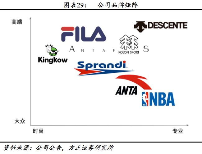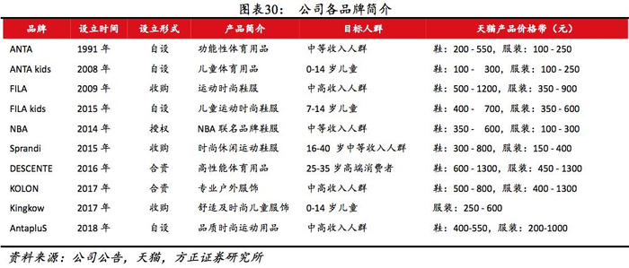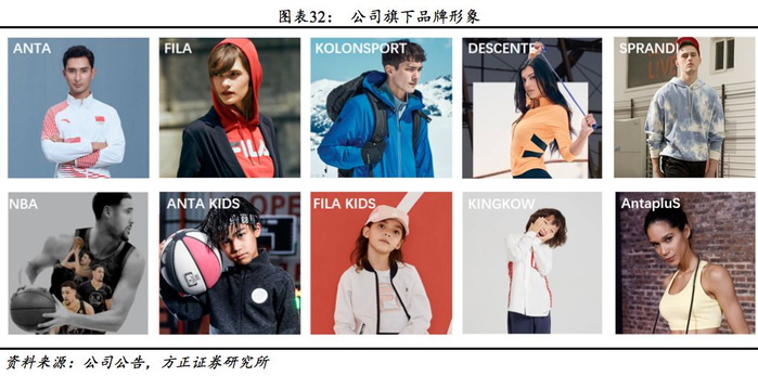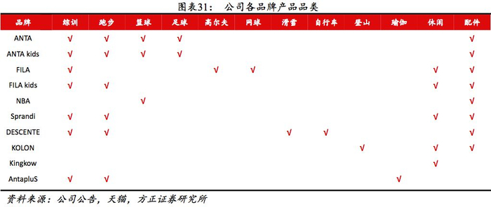 差异化布局覆盖全面。从产品定位看,公司旗下产品涵盖大众(安踏及安踏KIDS、Sprandi、NBA)、中高端(FILA、KOLON、KINKOW、AntapluS)、高端(DESCENTE)已形成较完整的价格梯队。从覆盖领域看,旗下产品涉及综训、跑步、篮球等大众体育项目,及滑雪、登山、自行车等户外项目,产品全面。