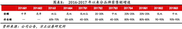 (2)从短期看:同店高成长,主品牌复苏明显,FILA维持高成长。2018Q1、Q2、Q3主品牌零售额增速分别达20%-25%、低双、中双,受益中秋错位、同店较快增长、折扣率提升等因素主品牌2018Q3继续复苏;2018Q1、Q2、Q3以FILA为主的非安踏品牌零售额分别增长80%-85%、90-95%、90%-95%,FILA拓店加速、同店高成长致业绩维持高增长。