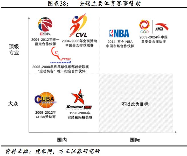 营销方面,1999年用五分之一的利润签约孔令辉为形象代言人,推出“我选择,我喜欢”广告语,在国内率先开创“体育明星+央视”营销模式,同年营业额增长翻倍。2001年,第一家专卖店开业后开始全国性品牌推广计划,2002-2007年相继签约巴特尔、女排名将冯坤、火箭队球星斯科拉,2003-2004年与搜狐打造安踏•搜狐体坛风云频道,2004年起安踏品牌成为CBA指定运动装备。2005年合作智威汤逊进行品牌梳理,推出“Keep Moving”口号。值得注意的是,2004年起安踏体育成为CBA唯一指定运动装备商后,CBA球员运动装备统一使用安踏品牌,带动业绩高速增长,2004-2007年营收分别达3.1亿、6.7亿、12.5亿、29.8亿,业绩连年翻倍。