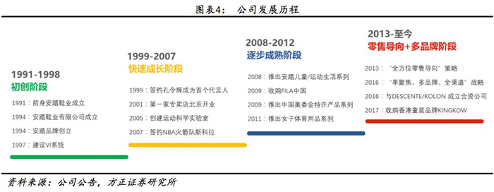 主品牌安踏自1994年成立以来深耕大众体育用品市场,连续十六年蝉联全国旅游运动鞋市场占有率第一,2011-2017年位居鞋服市场市占率内资第一,行业地位稳固。