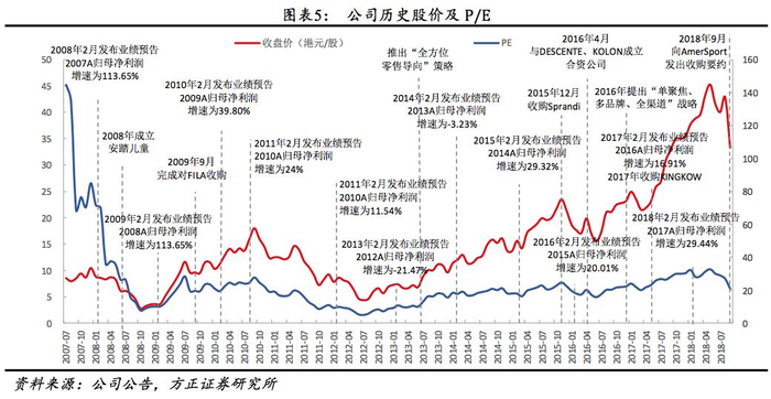 2008年10月以来受新股效应影响,股价、PE逐步恢复常态,随后股价迎来两个主要波段发展:(1)“过山车”阶段(2009年1月-2012年7月),该阶段前半段高业绩、强催化伴随阶段末期的行业周期低位及国内服装行业整体库存积压、线上挤出效应影响,导致该段股价及PE整体迎来“过山车”式行情,阶段末端PE低于该阶段启动点。(2)“长牛”阶段(2012年7月至今),2017年7月后公司业绩从行业危机中逐步复苏,迎来长期股价、PE稳步上行。该阶段同样分为两个明显的阶段,2012年7月至2016年4月,2016年4月至今,前半段股价、PE受业绩恢复稳步上行并受2015业绩高中放缓影响股价及PE短期小幅调整,后半段业绩整体稳定,但受持续并购催化、FILA业绩放量、内资运动品牌龙头预期逐步加深,股价、PE加速上行。整体看,①按照细分阶段,“过山车”阶段及“长牛”两阶段(2009年1月、2012年7月、2016年4月分别启动)波动规律完全符合消费周期划分(参考《消费周期:地产为轴,短周期的骚动》),公司股价变化与行业成长周期一致。②三个细分阶段中股价、PE较时间段所在周期(2009年1月-2012年7月、2016年4月至今)均出现明显的收购事件驱动,说明优质收购对股价、PE影响显著。
