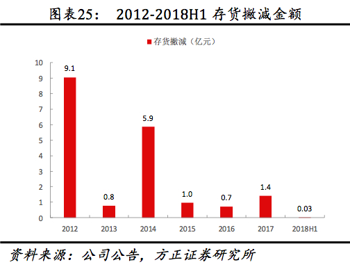 受直营店加速拓展存货周转天数提升,2018以来存货周转健康。整体看,受FILA等新品牌直营店拓展加速带动铺货提升影响,公司存货周转天数持续提升,2017较2012年存货周转天数提升24天至74天。从存货撇减额看,2012年受行业低谷影响,存货撇减金额达存货57%,该数据自2012年以来整体下降,2018年以来存货撇减金额仅0.03亿元,预计2018H1安踏、FILA库销比分别低于4、5,存货水平整体较为健康。