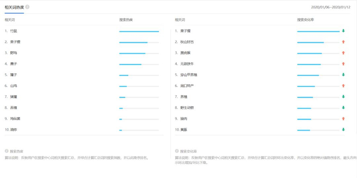 一点财经借助百度大数据,从关于“野味”的近七天搜索需求图中发现,“野味有哪些”、“果子狸”、“野鸡”等搜索指数较高,近期与“野味”关联较强、上升趋势较明显的是“蝙蝠”、“果子狸”、“竹鼠”等与疫情有关的内容。