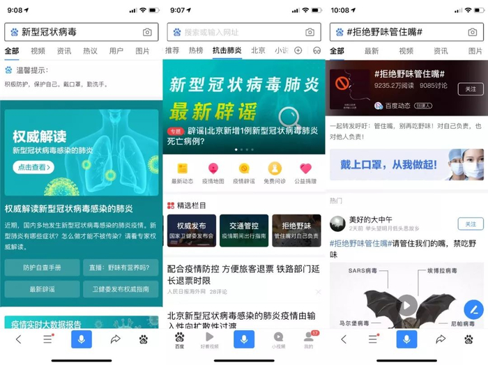 甚至,当公众在百度检索含有#野味#的关键词时,百度页面顶部会自动提示“拒绝野味,守护家人健康安全”,这其实也是一种正向的价值观的引导与科技为更好的表现。同时百度还设立了一个关于疫情和公共卫生安全的专项基金项目,总规模为3亿元,以支持一系列的防疫工作。