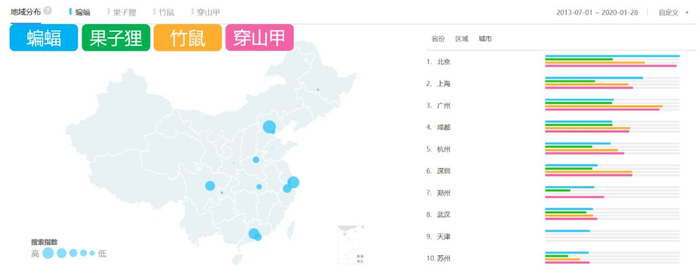 根据搜索指数,一点财经还发现,“疯狂的野味”不是少数地区专属,各地偏好各不同。北京、上海关注度最高的是蝙蝠;广州、成都则更关注竹鼠等等。