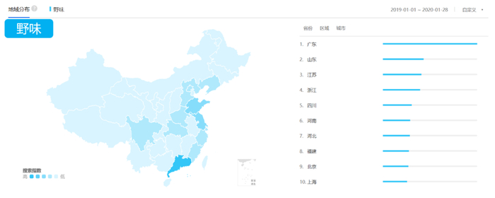 通过搜索大数据来看,“南方人爱吃野味”这一刻板印象,一定程度上是正确的。一点财经通过对“野味”的百度指数进行分析后发现,2019年1月1日至2020年1月28日的搜索指数人群分布,排名靠前的是广东、山东、江苏、浙江、四川、河南、河北、福建、北京、上海。