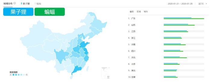 同样,对“果子狸”感兴趣的人群与“野味”高度相似,证明这些地方的人乐于讨论与疫情有关的内容。