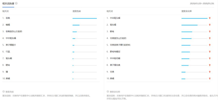 在1月20日至1月26日七天与“果子狸”有关的搜索词条中,“非典”、“蝙蝠”、“非典是怎么引起的”、“中华菊头蝠”(引发此次疫情的蝙蝠具体品种)、“菊头蝠”等,搜索出现明显上升。