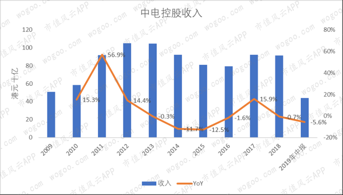 2018年,中电控股的收入为914.3亿港元,同比减少0.7%;2019年上半年的收入为438.4亿港元,同比减少5.6%。