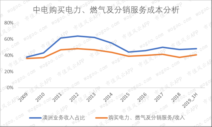 2018年,购买电力、燃气及分销服务占收入的比例达到37.4%,是公司最主要的成本。这项成本主要产生于澳洲业务,占总收入的比例与中电澳洲业务收入占比的走势基本一致。