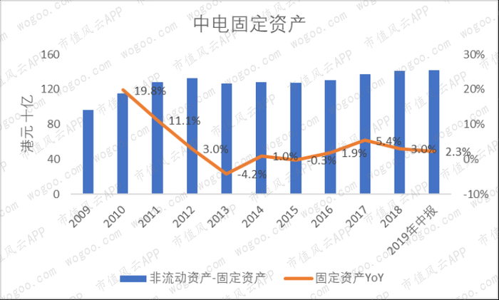 截至2018年底,中电的固定资产为1413.1亿港元,占总资产的比例达到61.3%。2009-2018年固定资产的CAGR为4.3%。
