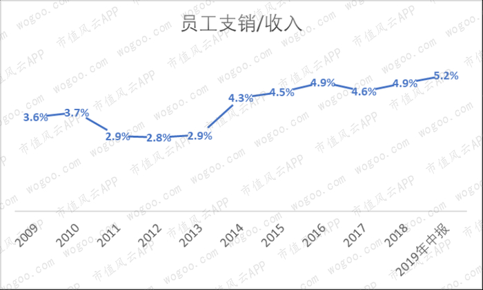 再来看员工费用。中电员工支出占收入的比例在过去10年中有所上升,其中2018年达到4.9%。
