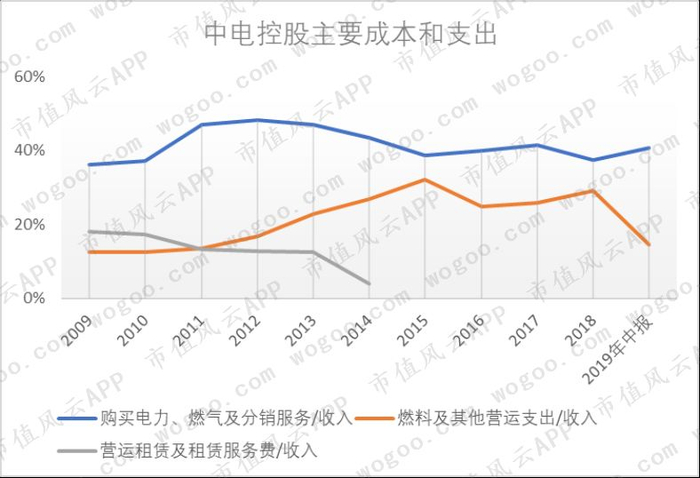 这其中,营运租赁及租赁服务费占收入的比例大幅下降了12.4个百分点,在2014年之后为0。这跟收购青山发电公司有关,后者从租赁提供方变成了中电的子公司。