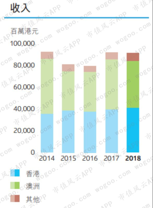 回到中电控股,2018年公司的收入为914.25亿港元,其中中国香港业务收入416.23亿港元,澳洲业务收入430.13亿港元,两者合计占比92.6%。