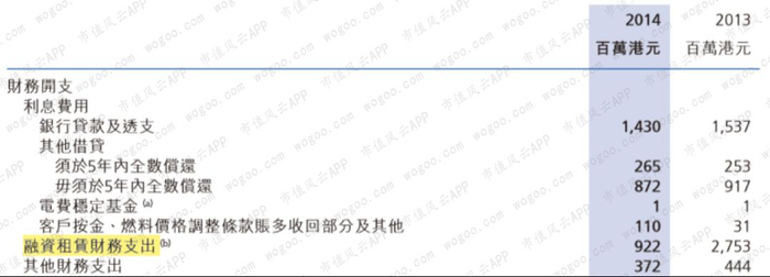 中电2014年的年报也显示,融资租赁财务支出同比大幅减少了18.31亿港元,银行贷款及透支的利息支出不增反减,与2014年借款整体利率略有下降有关。