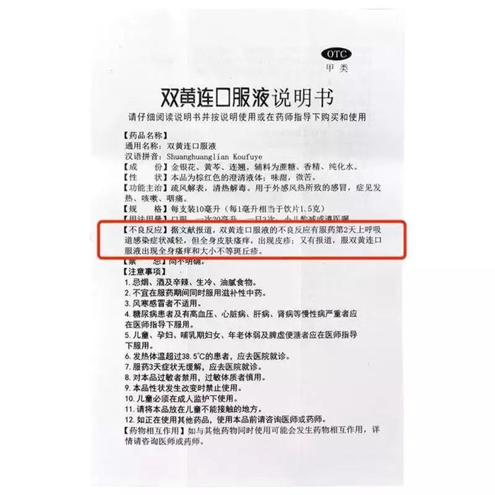 而且,双黄连口服液说明书上也标注着:“不良反应”主要是皮肤瘙痒、皮疹等过敏反应,或者是恶心、呕吐、腹痛、腹泻等轻微胃肠道反应。