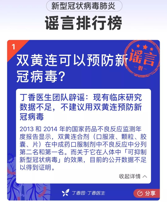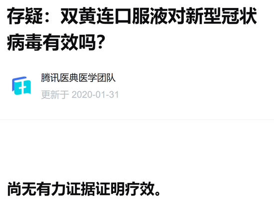 腾讯医典医学团队首当其冲,他们发布文章《存疑:双黄连口服液对新型冠状病毒有效吗?》,开篇第一句就是:尚无有力证据证明疗效。