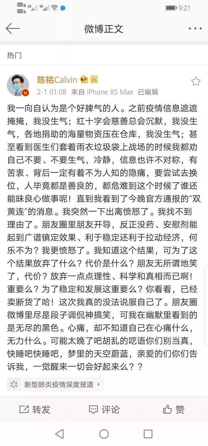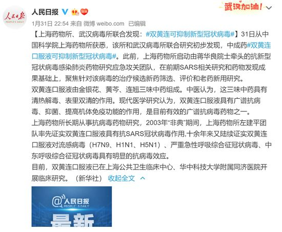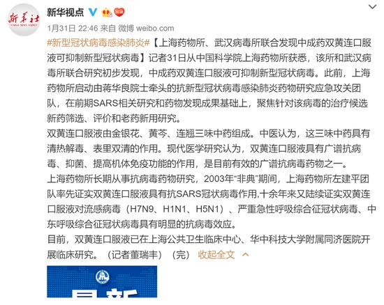 昨日晚间22点46分,“新华视点”发布了一则消息:上海药物所、武汉病毒所联合发现中成药双黄连口服液可抑制新型冠状病毒。