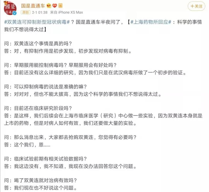 此消息被大多民众解读为“双黄连可以治疗新型冠状病毒”。