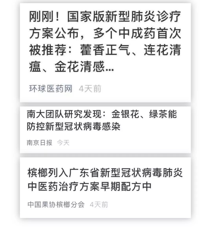 其实,早在双黄连火爆之前,已先后有消息说金银花、绿茶、藿香正气液、安宫牛黄丸、槟榔可用于诊疗新型冠状病毒。众所周知,槟榔是一类致癌物。